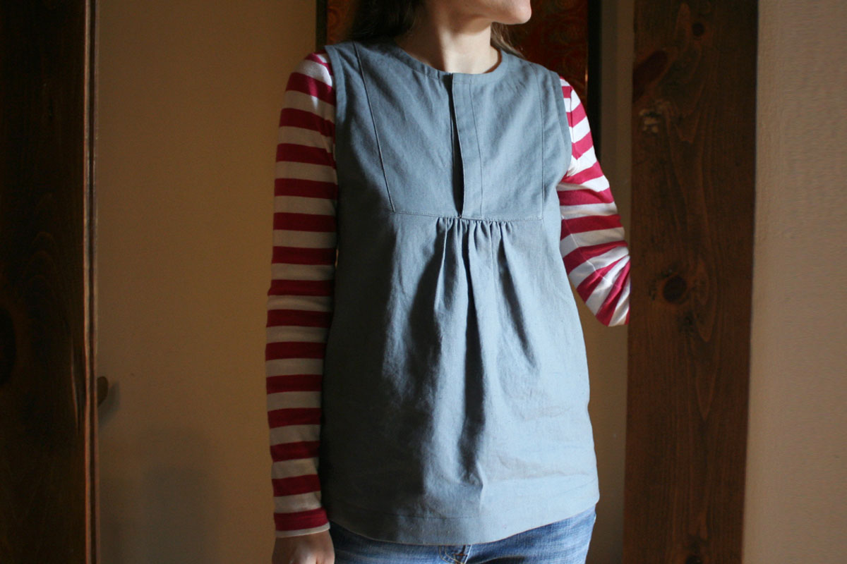 So the Tova pattern is great. I used Robert Kaufman's linen/cotton which is a bit heavy so although I had added the sleeves, they were too stiff and I took them off. But I quite liked wearing it with a shirt underneath and having playful bias tape around the inside edges is just plain fun. I've never been crazy about the collar when I've seen other Tovas so I left it out and used bias tape there too. I just think it makes a nice shape. Overall a great pattern and well suited to my, er, flattish chest.